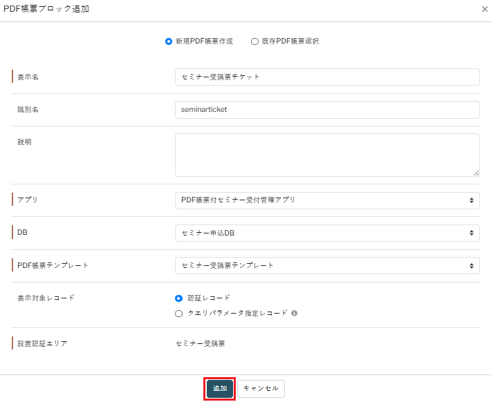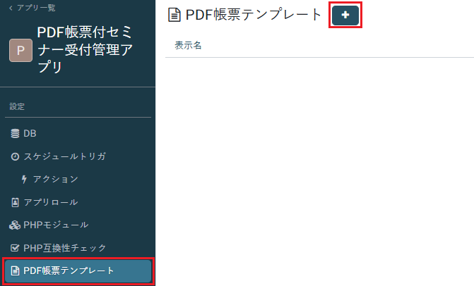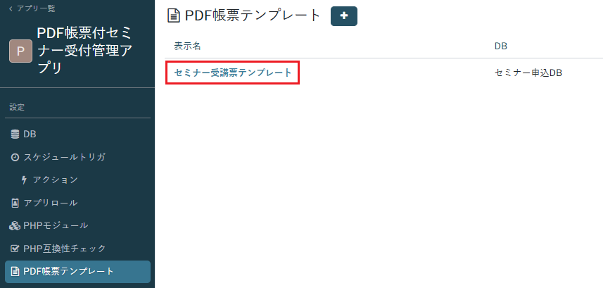 PDF帳票テンプレートの「+」をクリックし、「セミナー受講票テンプレート」を追加します。