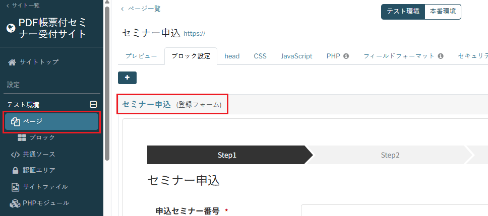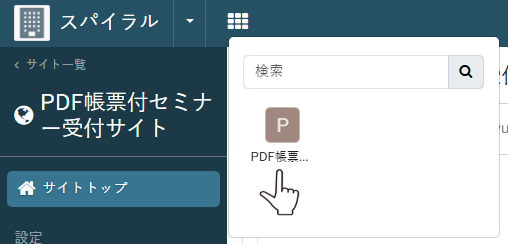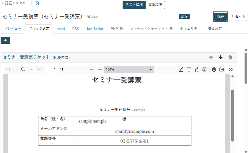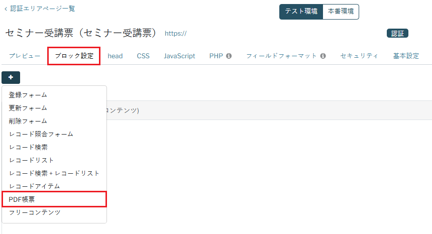 セミナー受講票(認証後トップページ)を選択し、ブロック設定から「PDF帳票」ブロックを追加します。
