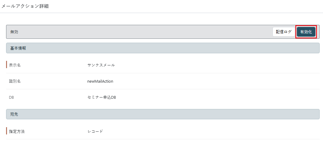 「サンクスメール」の詳細からメールアクションのステータスを「有効」に変更し、保存します。