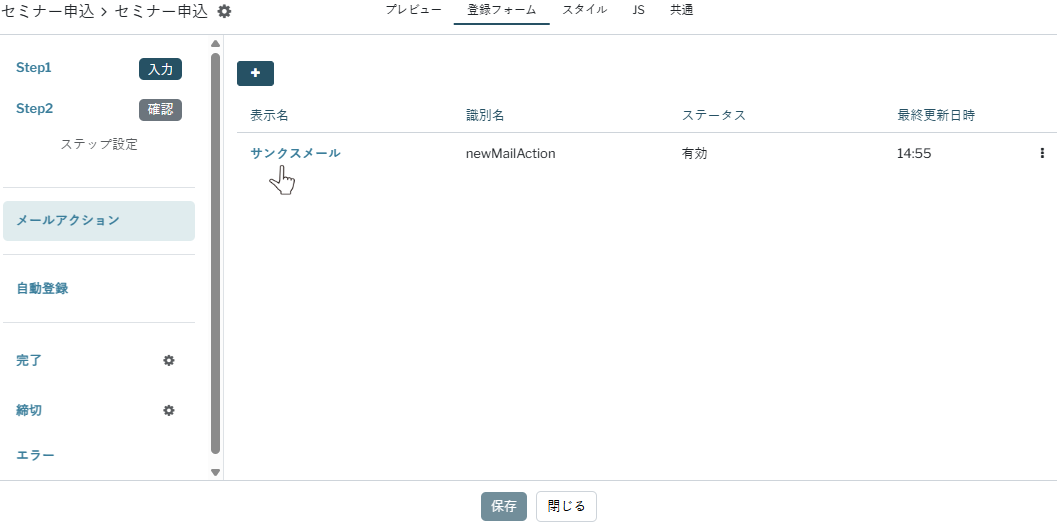 「セミナー申込(登録フォーム)」の詳細設定を開き、「登録フォーム」タブより「メールアクション」をクリックし、「+」よりメールアクションを作成します。