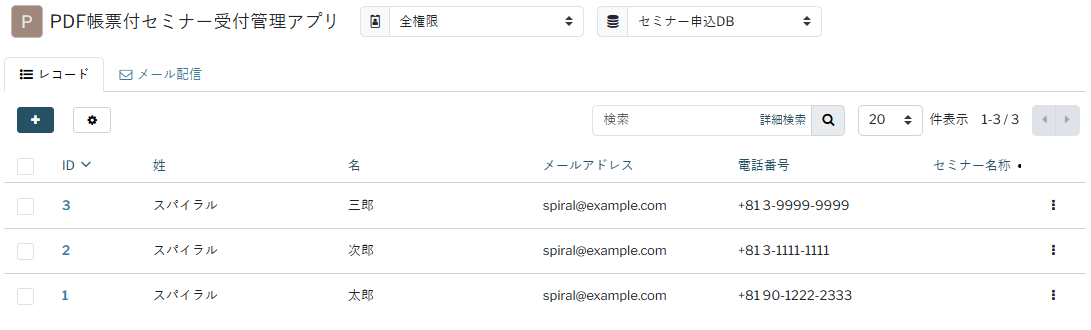 アプリロール「全権限」、DB「セミナー申込DB」を選択、セミナー申込レコードを確認することができます。