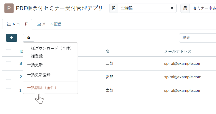 アプリロールに一括削除権限が付与されている場合、レコード一覧画面左上の「歯車」ボタンから「一括削除(全件)」を選択、レコードを一括削除できます。