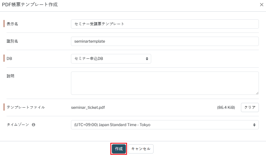 必要項目を入力、PDFテンプレートファイルをアップロードし「作成」をクリックし作成します。