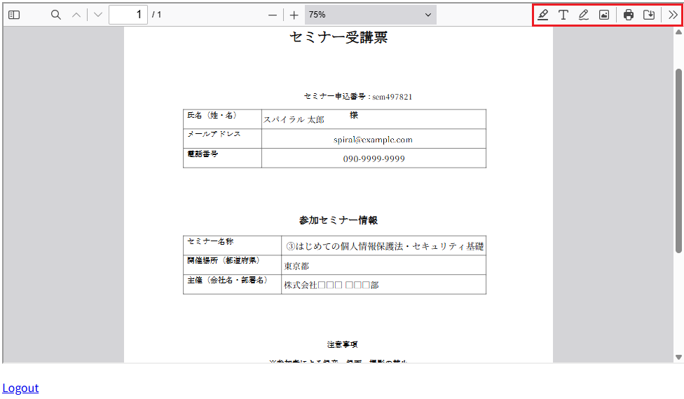 クリックログインURLを開くと認証エリアで設定した、セミナー受講票PDFが表示されます。