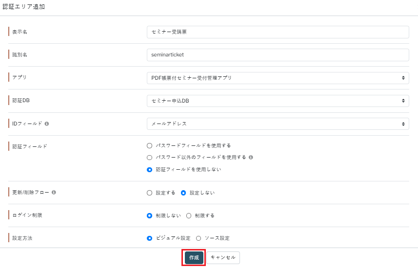 認証エリアの認証DBを「セミナー申込DB」に指定し、IDフィールドは「メールアドレス」を指定します。