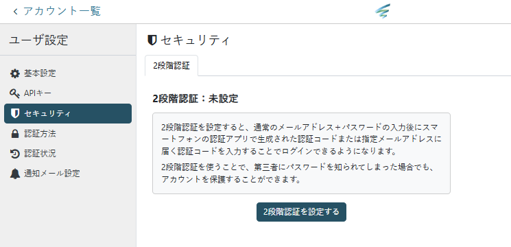 アカウント管理>セキュリティ設定から2段階認証設定の「不要/必要」が選択できます。