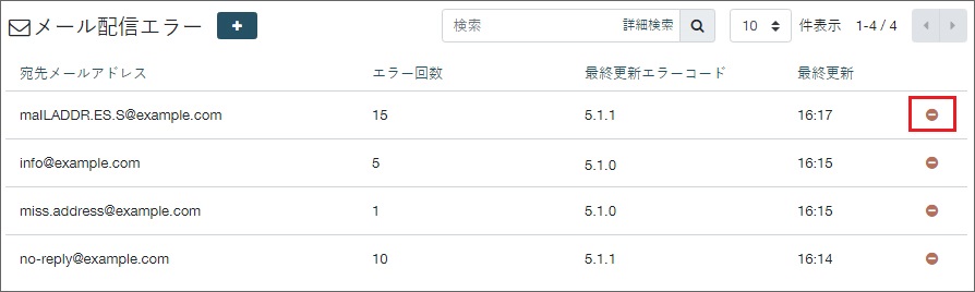 画面右の「削除マーク」をクリックすると配信エラー一覧から宛先メールアドレスを削除できます。