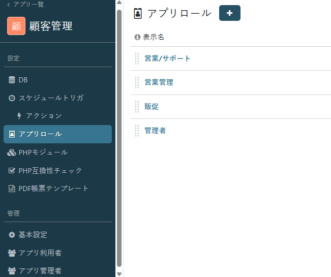 また、アプリロールごとにアプリ利用画面で表示するアプリロール、DB、フィールドの並び順をカスタマイズすることができます。