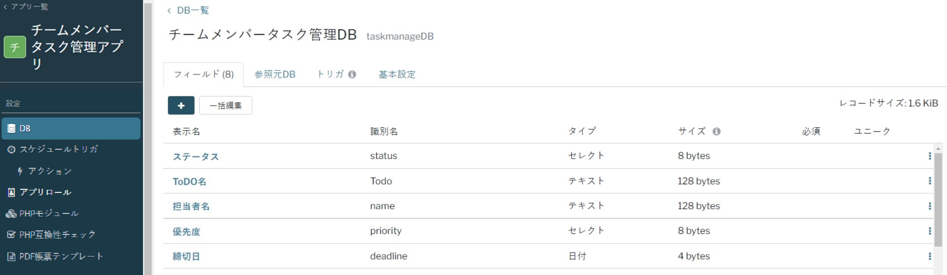 DB作成後、アプリ利用画面にてレコード登録やレコード一括操作などが行えます。