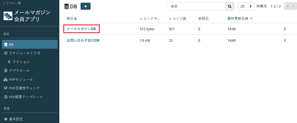アプリ管理画面から該当DBへ進み、削除したいDBのDB名をクリックします。