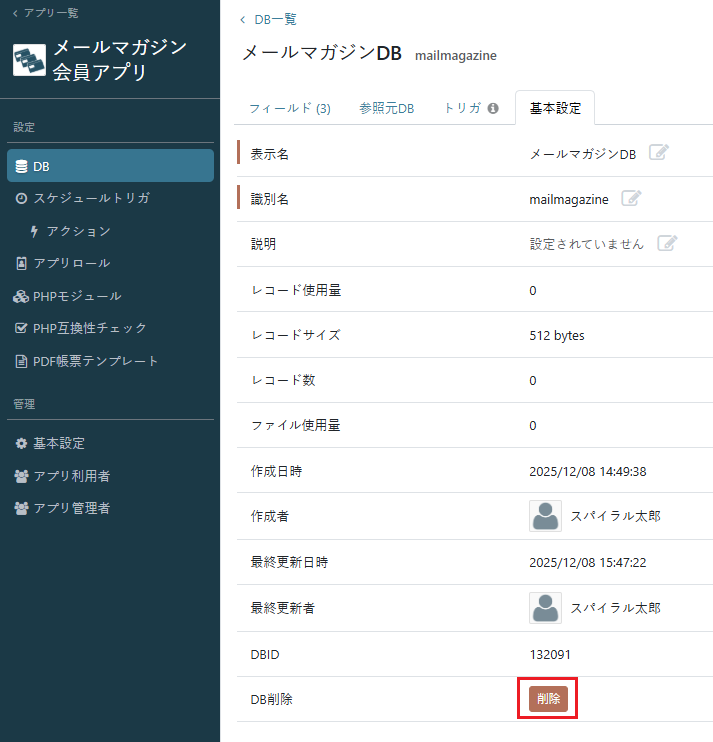 ※DBを削除した場合、DB内のデータ(レコード)もすべて削除されます。一度削除したDBや登録データ(レコード)、関連設定は削除後に復旧できません。