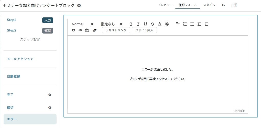 入力/確認ステップページと同様にエラーページの作成ができます。