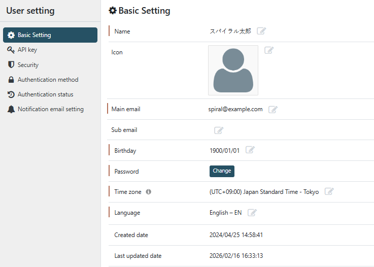 ユーザの言語設定にて、操作画面の言語表示を英語に変更できます。
