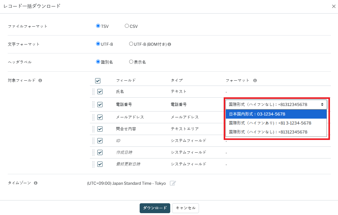 レコード一括出力において、電話番号フィールドのダウンロードフォーマットは「国際形式(ハイフンなし)」のみでしたが、許可国コードが「日本(+81)」に設定されている場合、フォーマットを指定してダウンロードできるように改善します。